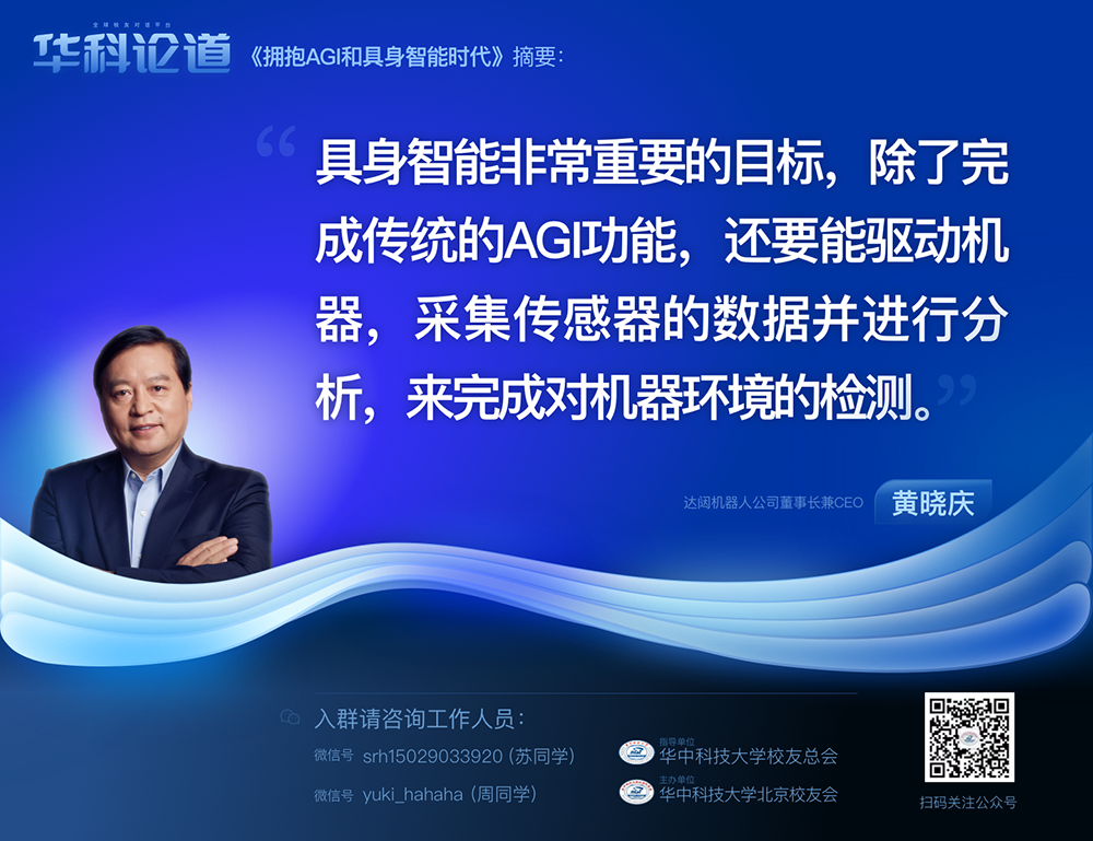 1月30日,在第五十五期「華科論道」上,由華中科技大學北京校友會主辦的活動迎來了一位特別嘉賓——達闥機器人公司董事長兼CEO黃曉慶先生,他帶來了「擁抱AGI和具身智能時代」的主題演講,為廣大校友帶來了精彩紛呈的分享。