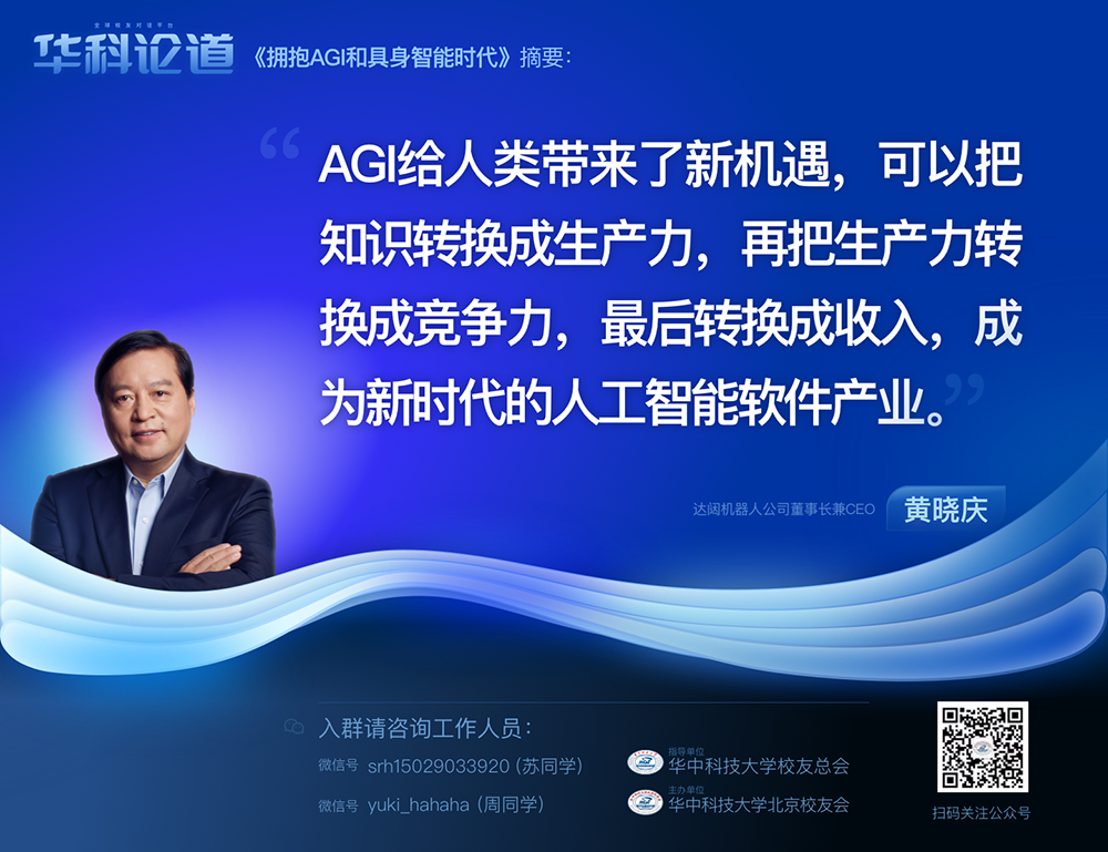 作為華中科技大學傑出校友及全球人工智能領域的前沿技術專家,黃曉慶先生結合自己多年在機器人行業的深入研究和實踐經驗,分享了對於通用人工智能(AGI)發展趨勢及其對各行各業影響的洞見。他認為,AGI將成為新時代軟件產業轉化知識、生產力、競爭力乃至收入的關鍵驅動力,以下是他的主要觀點和演講中的「金句」: